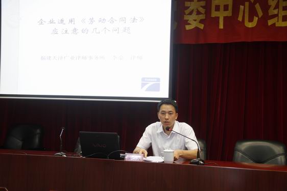 6月28日下午,外貿(mào)集團(tuán)邀請(qǐng)福建天澤廣業(yè)律師事務(wù)所專業(yè)律師到集團(tuán)舉辦《勞動(dòng)合同法》專題講座,包括集團(tuán)主要領(lǐng)導(dǎo)、總部大部分職工以及各公司主要負(fù)責(zé)人在內(nèi)近百人參加了講座。通過(guò)舉辦專題講座,進(jìn)一步加強(qiáng)了職工對(duì)勞動(dòng)合同法的理解,提高了集團(tuán)全體員工在勞動(dòng)用工方面的法律意識(shí),對(duì)集團(tuán)加強(qiáng)法律工作,防范法律風(fēng)險(xiǎn)起到了積極促進(jìn)作用。