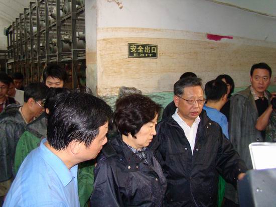 6月25日上午,踩著厚厚的淤泥,趟過十幾厘米深的積水,省委書記孫春蘭,省長黃小晶,省委常委、省委秘書長楊岳和省委常委、省政法委書記徐謙,南平市委書記雷春美、代市長裴金佳,在省外貿集團董事長張忠、總經理兼南紡公司董事長陳軍華、董事陳建文及公司總經理李祖安等陪同下親臨南紡公司察看災情,慰問干部職工群眾,指導部署抗洪救災。他們來到南紡公司紡紗一車間后紡工序、織布廠準整車間等一一詳細察看。雖然公司目前遇到很大困難,但廣大職工并沒有氣餒,看到職工精神面貌很好,孫春蘭很高興。她要求南紡公司要組織更多力量清理廠房、搶修設備,以最快的速度、最高的效率,爭取盡快恢復生產。南紡公司職工表示,在省委、省政府,市委、市政府的關心和指導下,在解放軍、武警官兵和全省國資系統企業以及南平市兄弟單位強有力的支持下,有信心、有決心奪取抗災搶險和恢復重建的勝利,建設一個更加美好的新南紡。