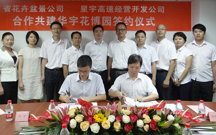 8月19日上午,外貿集團權屬福建省花卉盆景有限公司與福州星宇高速公路經營開發有限責任公司舉行《設立福建省華宇花博園有限責任公司合資協議書》簽約儀式,外貿集團副總經理、省花卉公司董事長游向陽和福建高速福州分公司董事長、星宇高速經營開發公司董事長張中光分別代表雙方在合作協議上簽字。