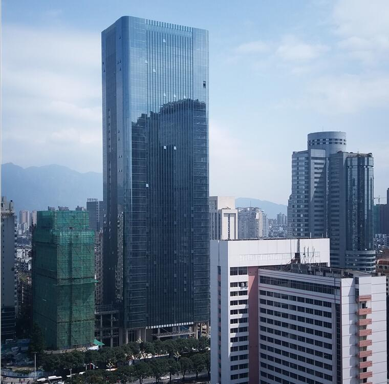 大廈玻璃幕墻由武漢中建幕墻有限公司加工完成,板塊數量總計約4200樘,主要位置均采用了Low-E三銀夾膠中空玻璃,這種玻璃具有安全系數高、遮陽系數高、傳熱系數低、保溫效果好、綠色節能的特點,能較大提升室內環境舒適度,具有較強的防太陽輻射能力,為福建首座采用此類玻璃幕墻的建筑。幕墻所采用的大部分玻璃板塊均為超長規格玻璃,特別是四角部位采用了生產技術難度較高的彎弧玻璃,并且與平直區玻璃顏色保持一致,具有極高的生產技術難度。標準層單元板塊規格為