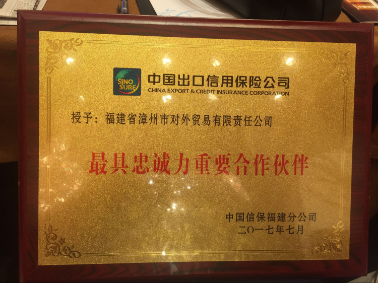 漳州外貿公司獲中國出口信用保險公司福建分公司 “最具忠誠力合作伙伴”稱號